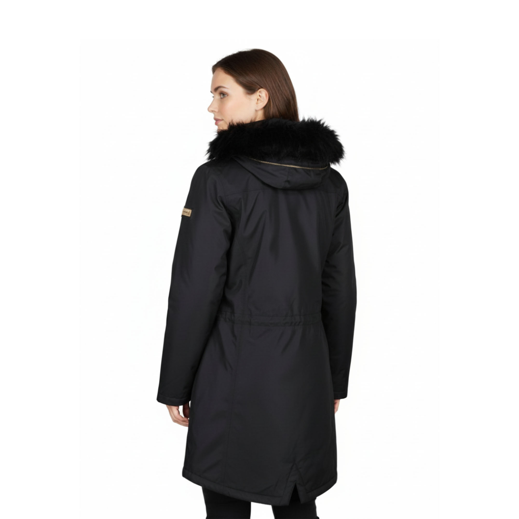 Женская куртка Regatta Lexia изготовлена из плотной мембранной ткани Isotex с показателем водонепроницаемости 5000 мм. За счет высокого уровня влагоотведения с показателем 8000 м2/24 ч, куртка выводит лишнюю влагу на поверхность ткани, позволяя поддерживать комфортную температуру тела и сухость. Технологичный утеплитель Thermoguard изготовленный из синтетического волокна, хорошо задерживает теплый воздух внутри. Износостойкое водоотталкивающее покрытие поможет надолго сохранить первозданный внешний вид куртки и глубокий черный цвет. Свободный, удлиненный крой не стесняет движений, а эластичная кулиска на поясе, предотвратит проникновение ветра вовнутрь и поможет подчеркнуть талию. Подкладка из полиэстера создаст дополнительный утепляющий слой. Двойная серебристая молния и кнопки добавляют образу завершенный вид. Вшитый регулируемый капюшон отделан опушкой из искусственного меха, что дополнительно защитит лицо от ветра. Манжеты рукавов можно отрегулировать по объему. Два дополнительных кармана по бокам помогут согреть руки в непогоду и прихватить с собой нужные мелочи. Regatta Lexia - это отличный вариант для активного отдыха с повышенной влажностью, или ежедневного ношения в городе.Особенности и преимущества: