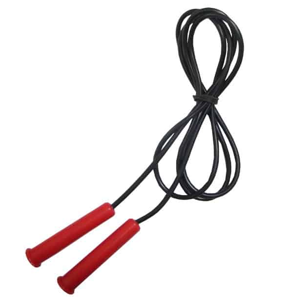 Скакалка с цветным шнуром с пластмассовыми ручки.